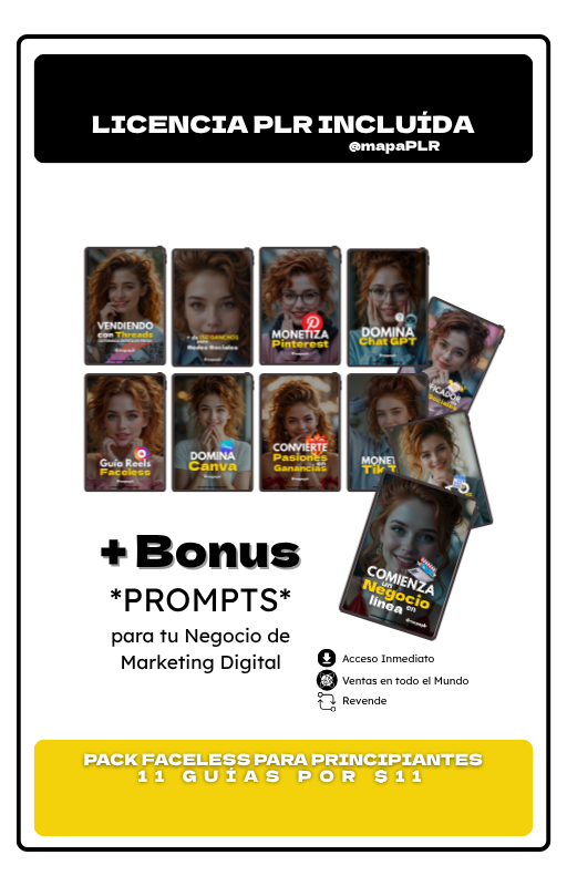 El Pack Faceless para Principiantes te ofrece todas las herramientas que necesitas para gestionar tu Negocio Online, sin necesidad de mostrar tu rostro. Además te propocionamos recursos listos para usar y una licencia PLR para que puedas acelerar el proceso y empezar a vender rápidamente.